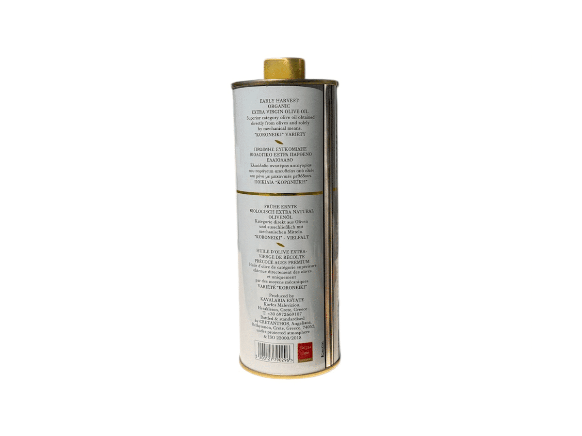Kavalaria Estate organic extra virgin olive oil is produced on the slopes of Mount Psiloritis in Crete. Made exclusively from the Koroneiki variety, it is harvested early to preserve freshness and aromatic intensity. Its profile combines green fruit notes, herbal nuances, and a subtle peppery finish, making it a refined choice for demanding palates.